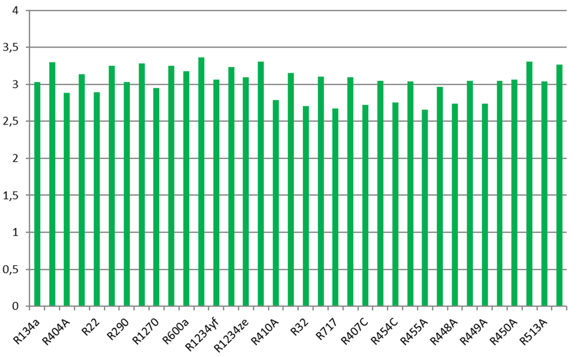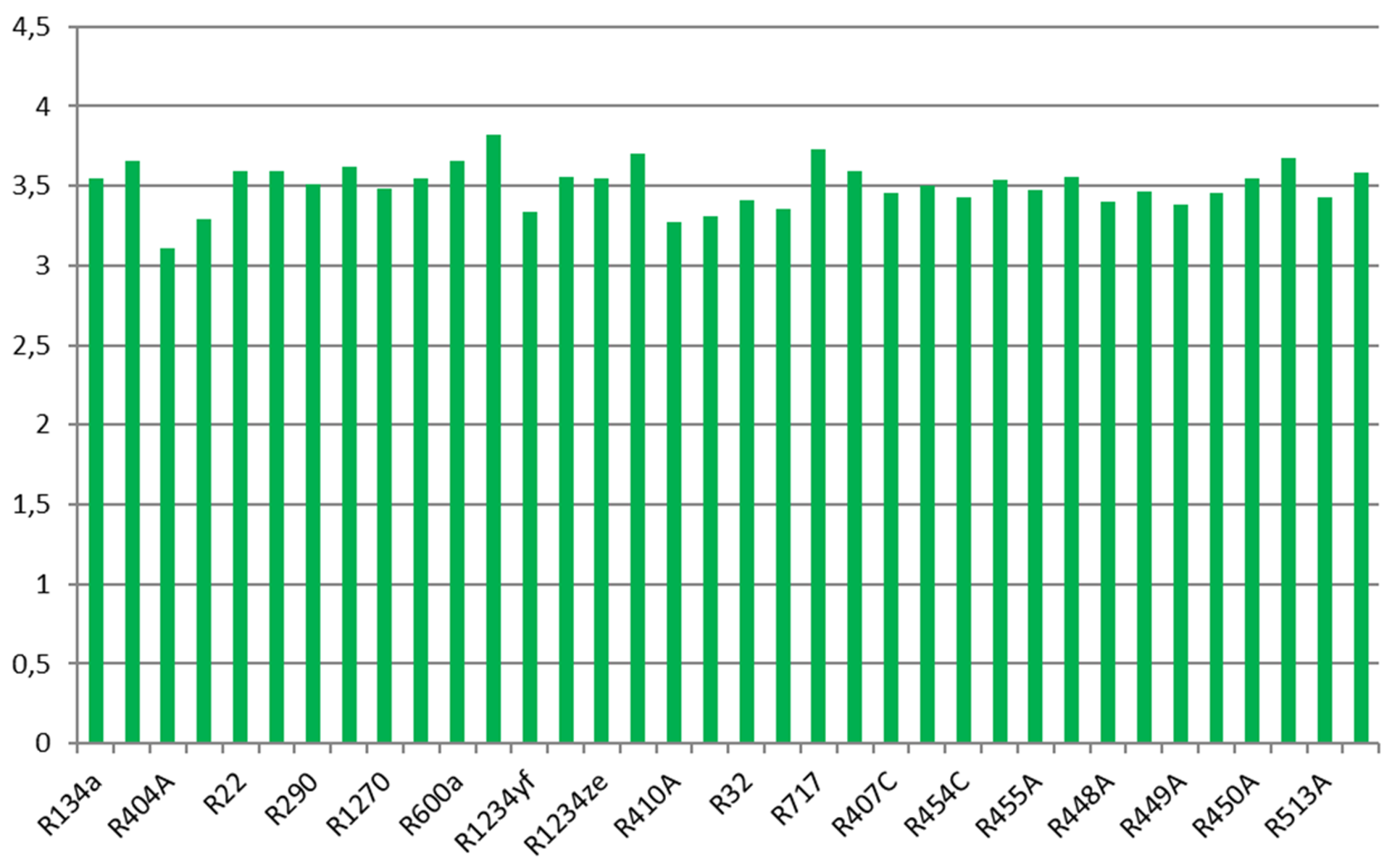 Ebenso verhält es sich beim COP abhängig von der nutzbaren Überhitzung. Hier liegen die Werte der Kältemittel jedoch viel enger zusammen als bei der volumetrischen Kälteleistung. R404A mit niedriger Überhitzung liegt bei etwa 3,1, R600a mit hoher nutzbarer Überhitzung bei etwa 3,8. Die meisten Kältemittel liegen enger zusammen. Ein Kältemittel mit niedriger volumetrischer Kälteleistung kann also effizienter sein – die beiden Werte hängen nicht direkt zusammen.