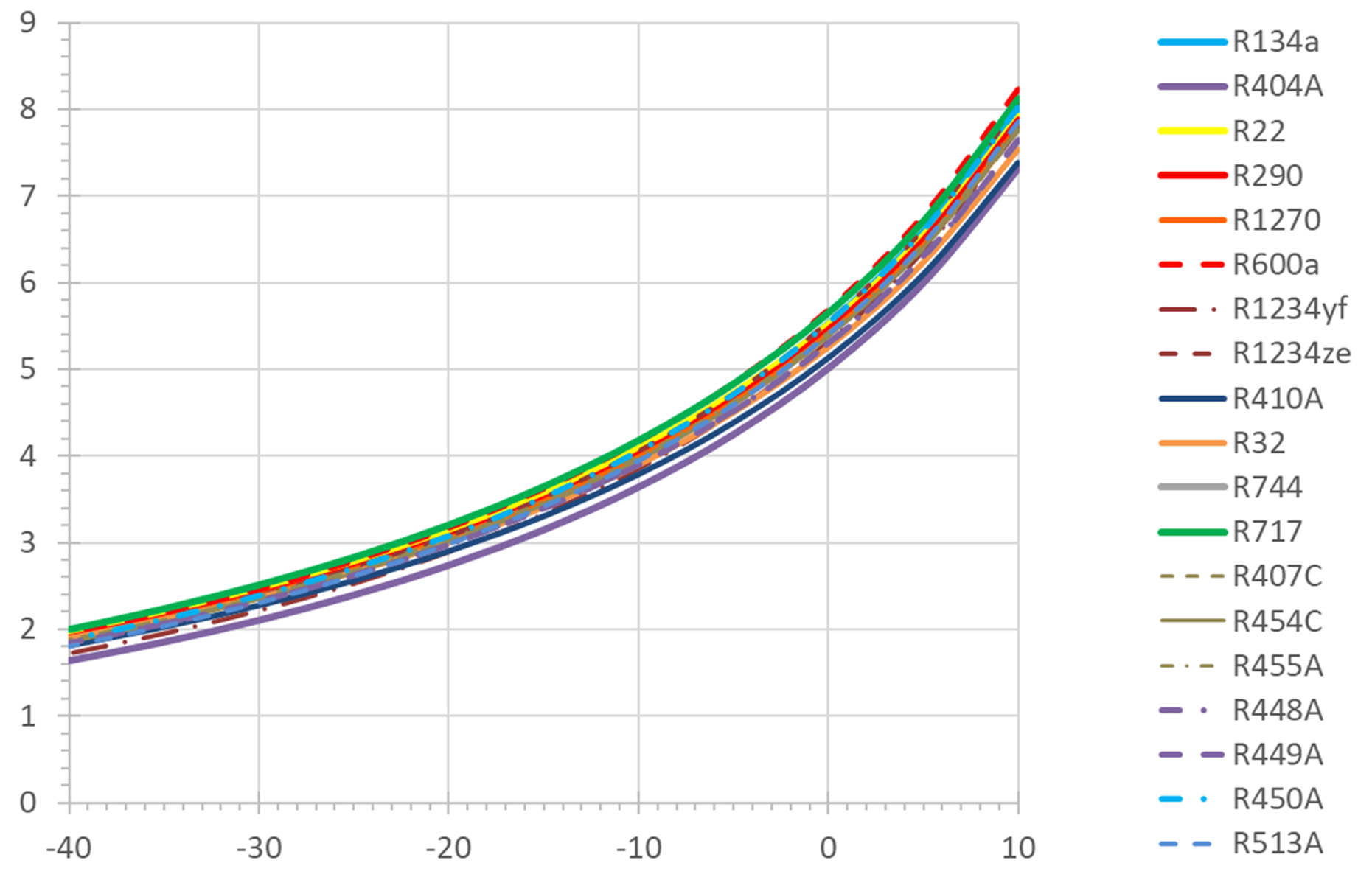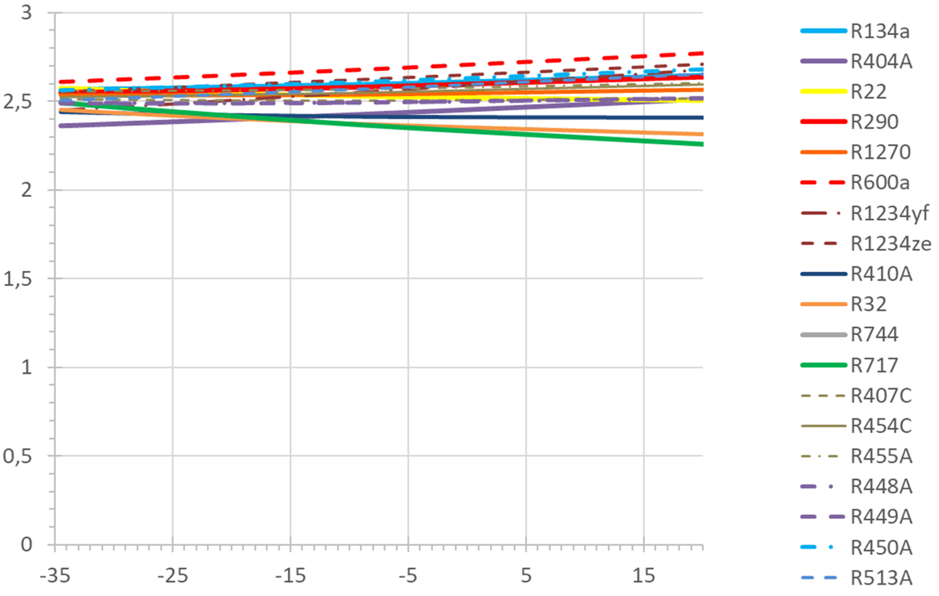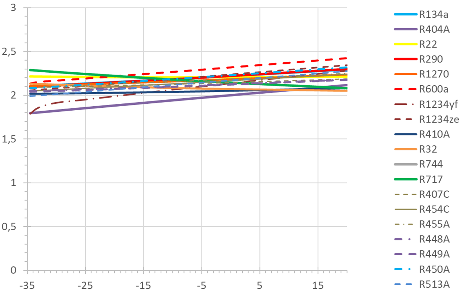 - Bei sehr hoher Überhitzung zeigt R600a den höchsten COP, sogar etwas höher als R717 bei niedrigster Überhitzung. Die niedrigsten COP-Werte zeigen hier R32 und R717, R22 liegt etwa in der Mitte.