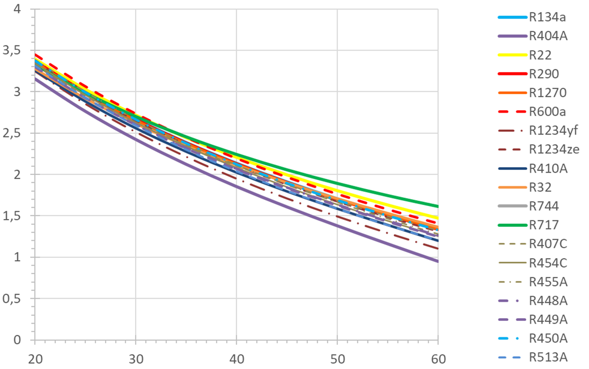 Die Kälteleistungszahl COP zeigt ein ähnliches Bild: Der COP fällt mit steigender Verflüssigungstemperatur. Am stärksten ist die Auswirkung bei R404A, am niedrigsten bei R717. Die meisten anderen Kältemittel verhalten sich zueinander ähnlich.