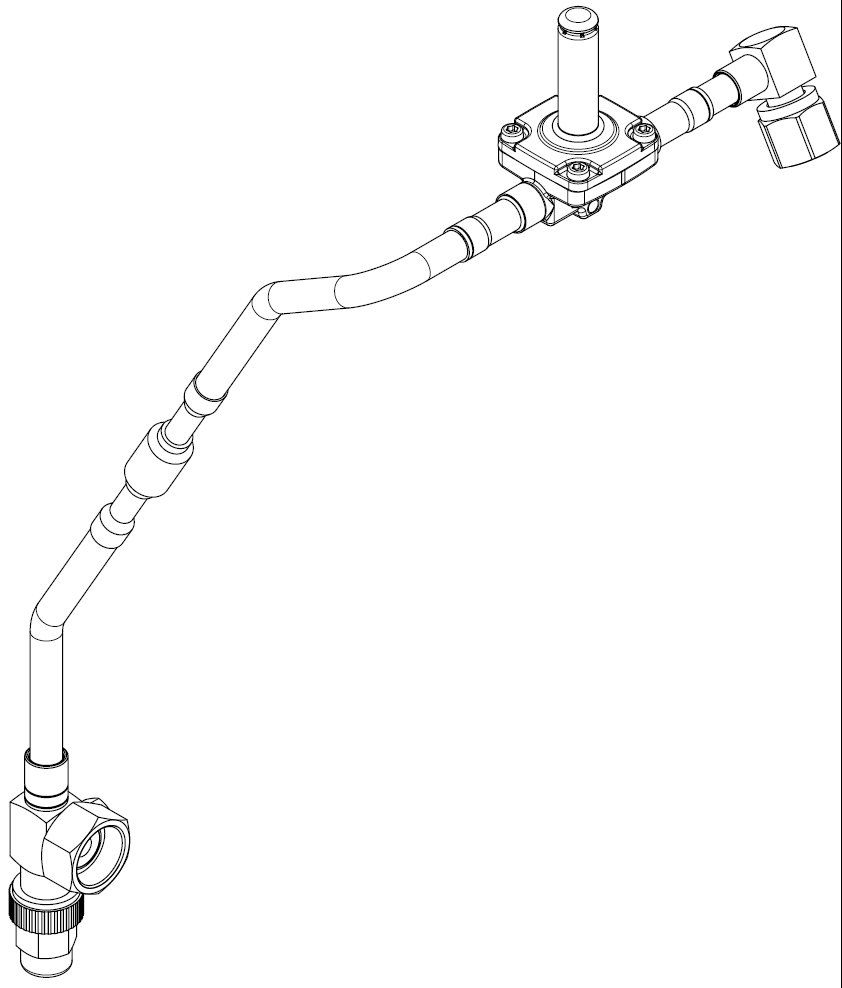 The kit is mounted on the compressor, the piping branches off from the frequency inverter cooling line. The LI solenoid valve is wired and controlled via the frequency inverter. For retrofitting, see SW-165 (described there for CSVH3). Since the kit fits any CSVH2 compressor and no further piping is connected, the dimensions of the individual components are not relevant.