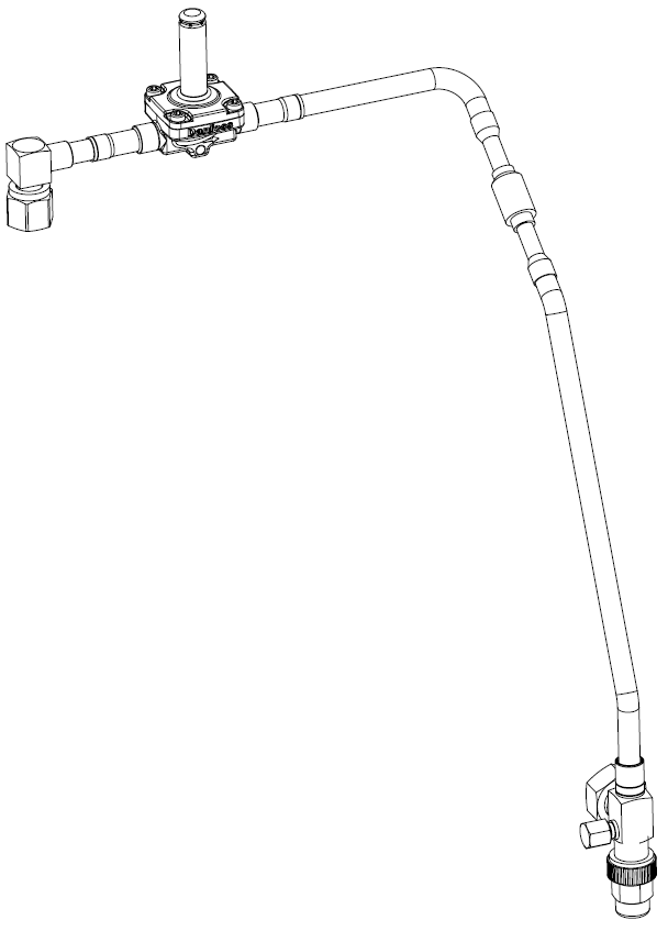 The kit is mounted on the compressor, the piping branches off from the frequency inverter cooling line. The LI solenoid valve is wired and controlled via the frequency inverter. For retrofitting, see SW-165. Since the kit fits any CSVH3 compressor and no further piping is connected, the dimensions of the individual components are not relevant.