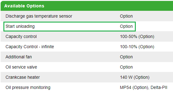 If a specific compressor is selected in the Bitzer Software, the tab "Technical Data" indicates if start unloading is available: