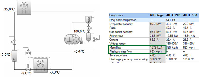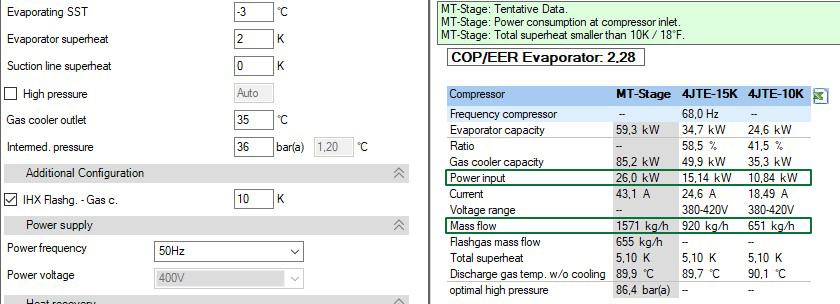 - Cooling capacity of the medium temperature compressor stage (Qo MT): 60 kW