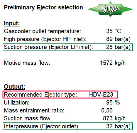 The recommended ejector HDV-E23 can therefore suck in 873 kg/h and deliver to an intermediate pressure that is 4 bar higher.