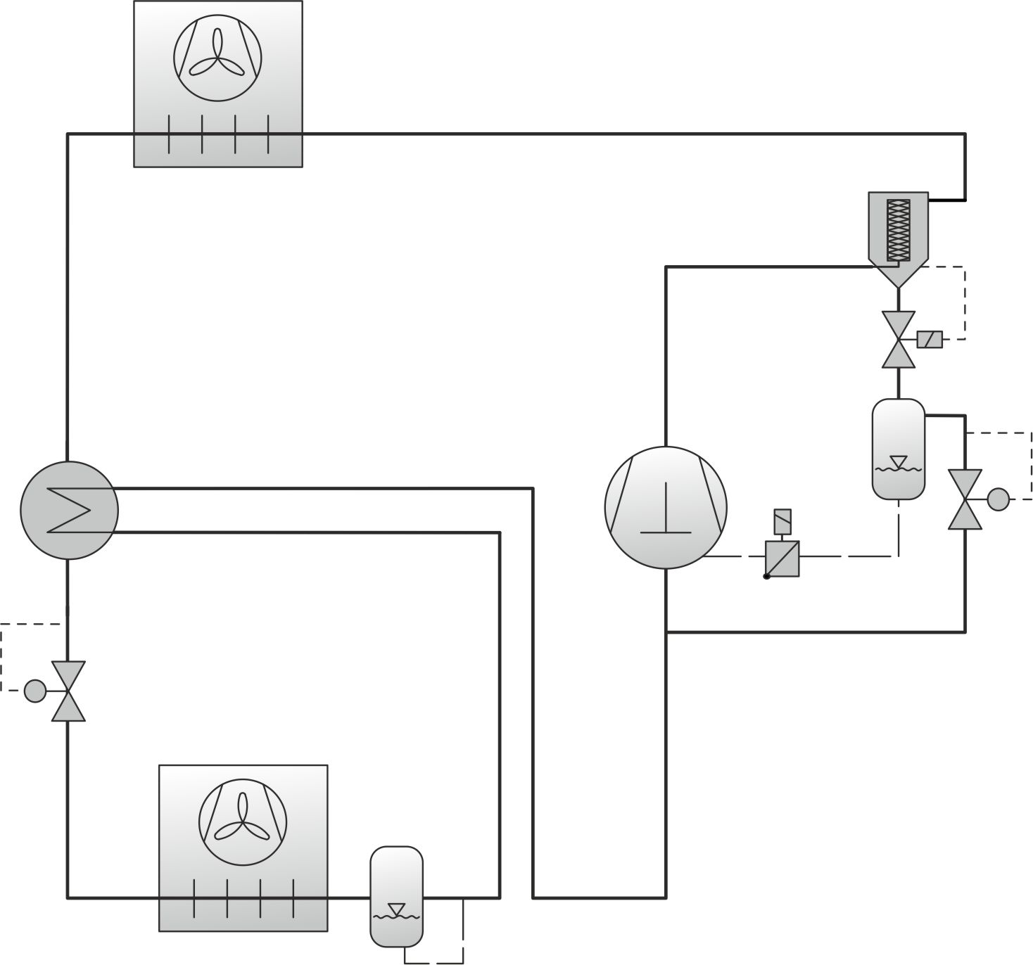 - No overheating control at the outlet of the evaporator, but operation with flooded evaporator.