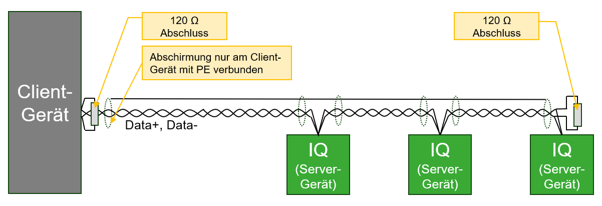 - Die Abschirmung darf nur an einem Ende des Busses angeschlossen werden (bevorzugt am Client-Gerät), um unerwünschte Erdströme in der Abschirmung zu vermeiden. Nur Data+ und Data- müssen angeschlossen werden. COM1 GND kann angeschlossen werden, wenn dies für das Client-Gerät erforderlich ist. Die Abschirmung muss jedoch über die gesamte Bus-Länge ununterbrochen sein.