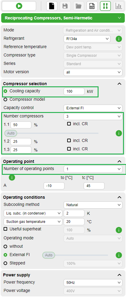 The Bitzer Software can be used to design compound systems for semi-hermetic/open drive and 2-stage reciprocating compressors. The procedure is illustrated here by way of example: