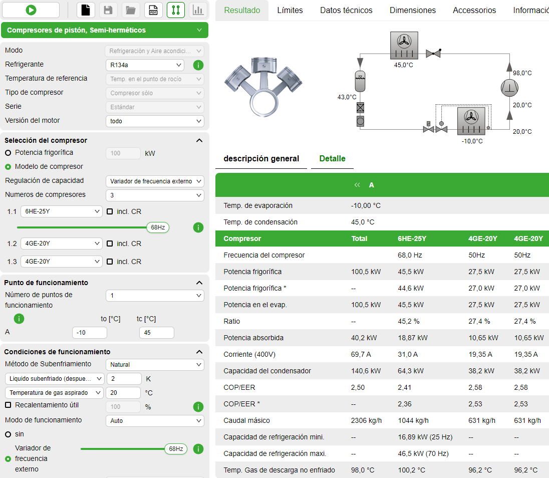El software propone 3 compresores que alcanzan la potencia especificada. Seleccionar la pestaña Detalle. Hacer click en el símbolo