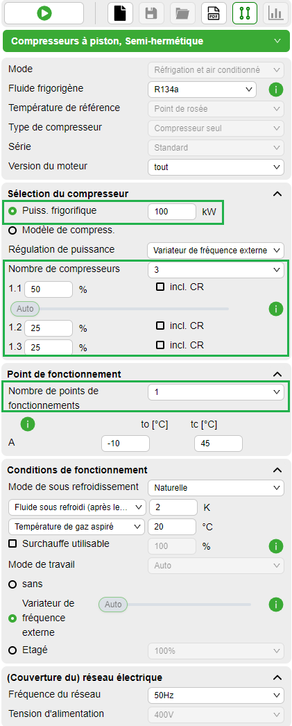 Les compresseurs sélectionnés peuvent être modifiés manuellement dans le menu à gauche en cliquant sur les flèches