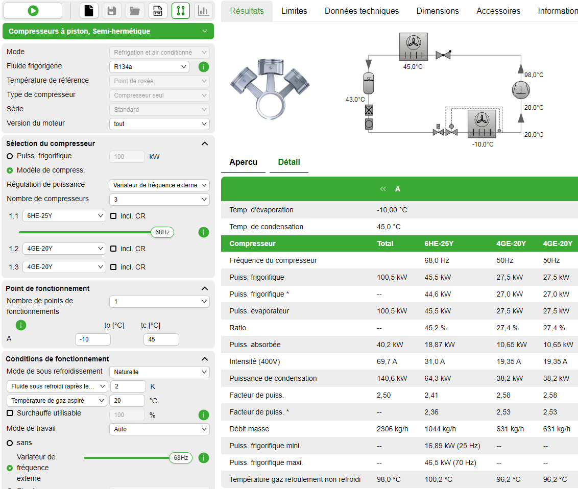 Le logiciel propose 3 compresseurs avec lesquels la puissance indiquée peut être atteinte. Sous l’onglet Détail en cliquant sur le symbole