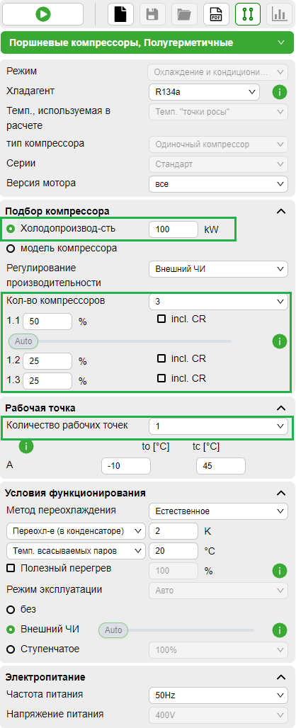 Bitzer Software использоваться для подбора многокомпрессорных систем с полугерметичными/открытыми и двухступенчатыми поршневыми компрессорами. Процедура проиллюстрирована здесь в качестве примера: