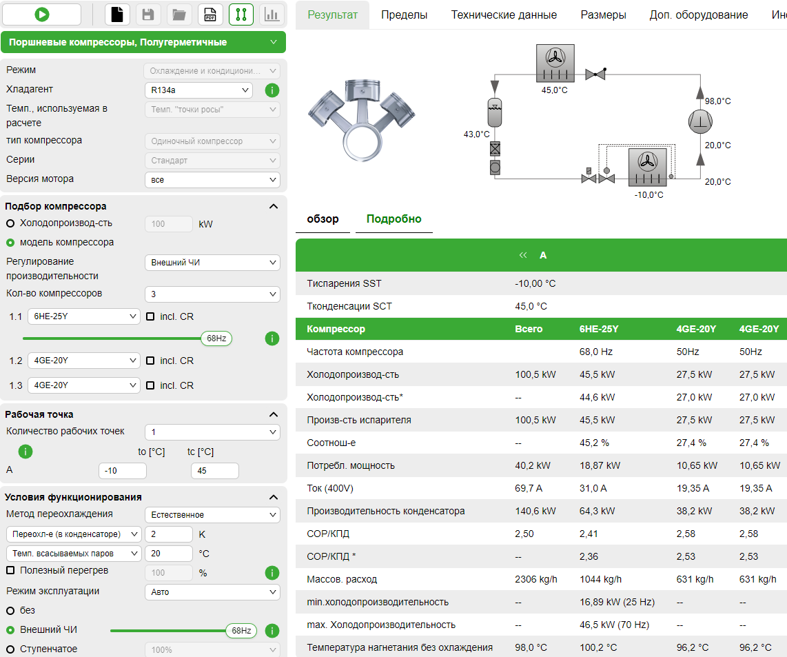 Программа подбора предлагает 3 компрессора, которые можно использовать для достижения заданной производительности. При выборе вкладки Подробно и клика по