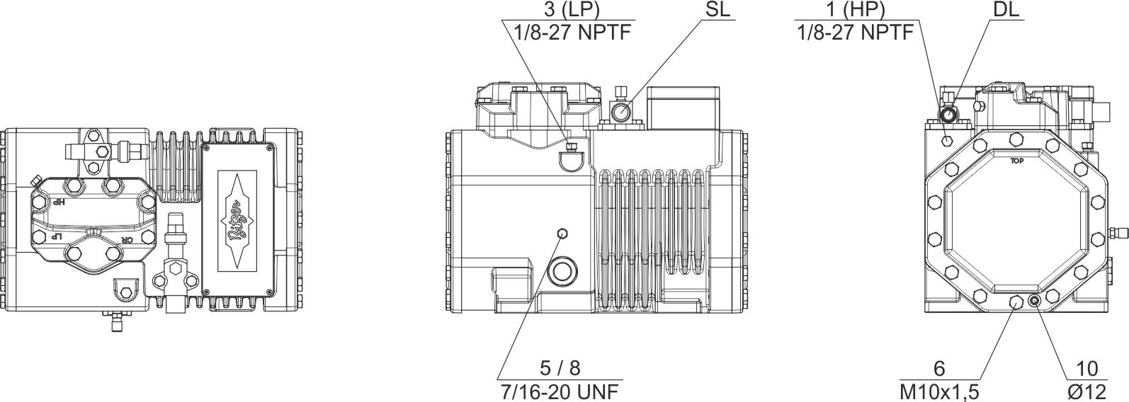 1 (HP) | Connection for high pressure switch(HP) | 3 (LP) | Connection for low pressure switch (LP) |