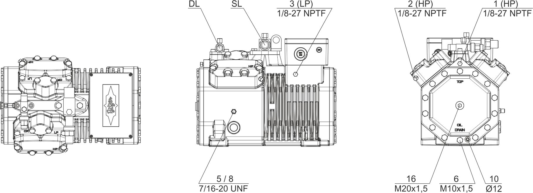 These instructions are also applicable for the conversion of LHL3 condensing units. Since this series contains 2 cylinder compressors, the different positions of the suction and discharge gas valves, and the connections for the high and low pressure switches at the compressor must be considered!
