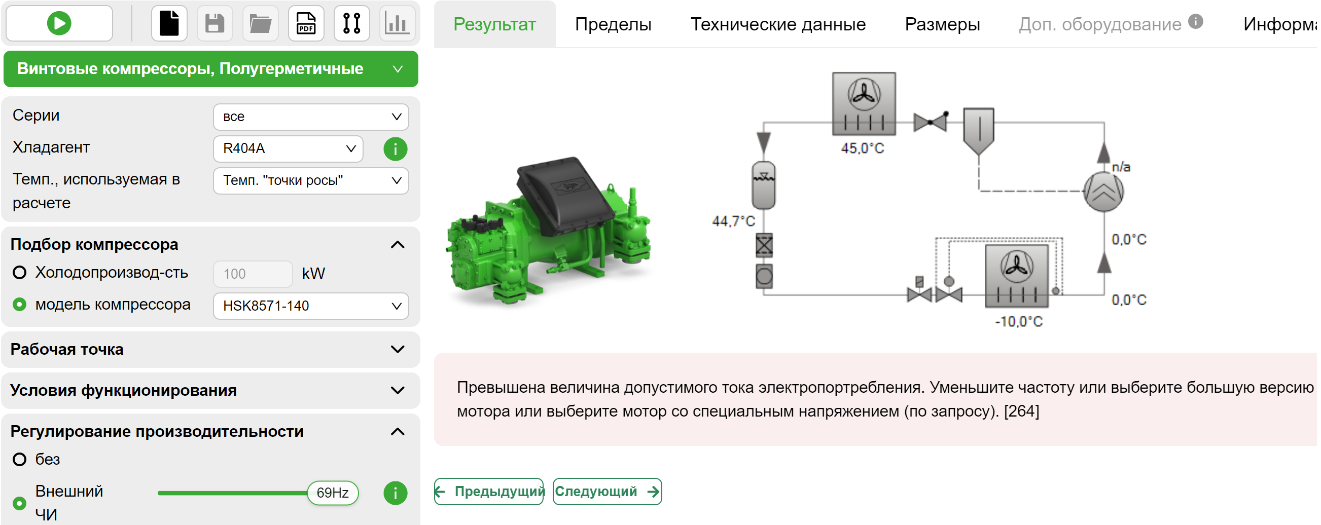 Постепенно увеличивая рабочую частоту (ползунок "Внешний ЧИ"), можно найти максимальную рабочую частоту для выбранной комбинации компрессора, хладагента и рабочей точки. Для работы выше этой частоты требуется более мощная версия мотора (выбирается в раскрывающемся меню "Модель компрессора") или мотор со специальным напряжением (Моторы компрессоров). При этом расчет моторов со специальным напряжением не реализован в Bitzer Software и доступен по запросу.