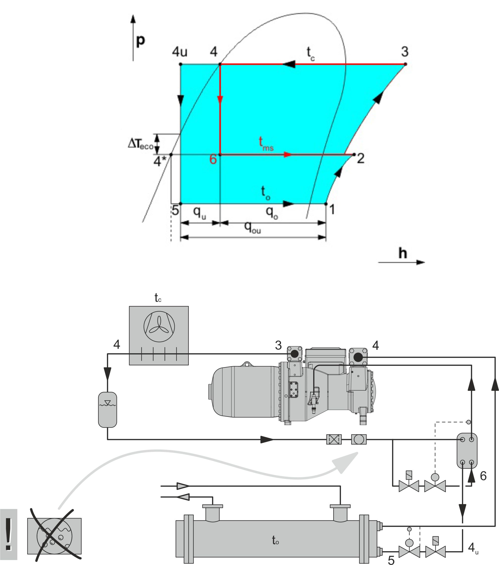Die BITZER Software gibt standardmäßig 10 K Temperaturdifferenz zwischen gesättigter ECO-Temperatur und unterkühlter Flüssigkeit vor, wenn Autom. Unterkühlung ausgewählt ist. Diese Temperaturdifferenz ist im unten stehenden Diagramm als ΔTeco bezeichnet.