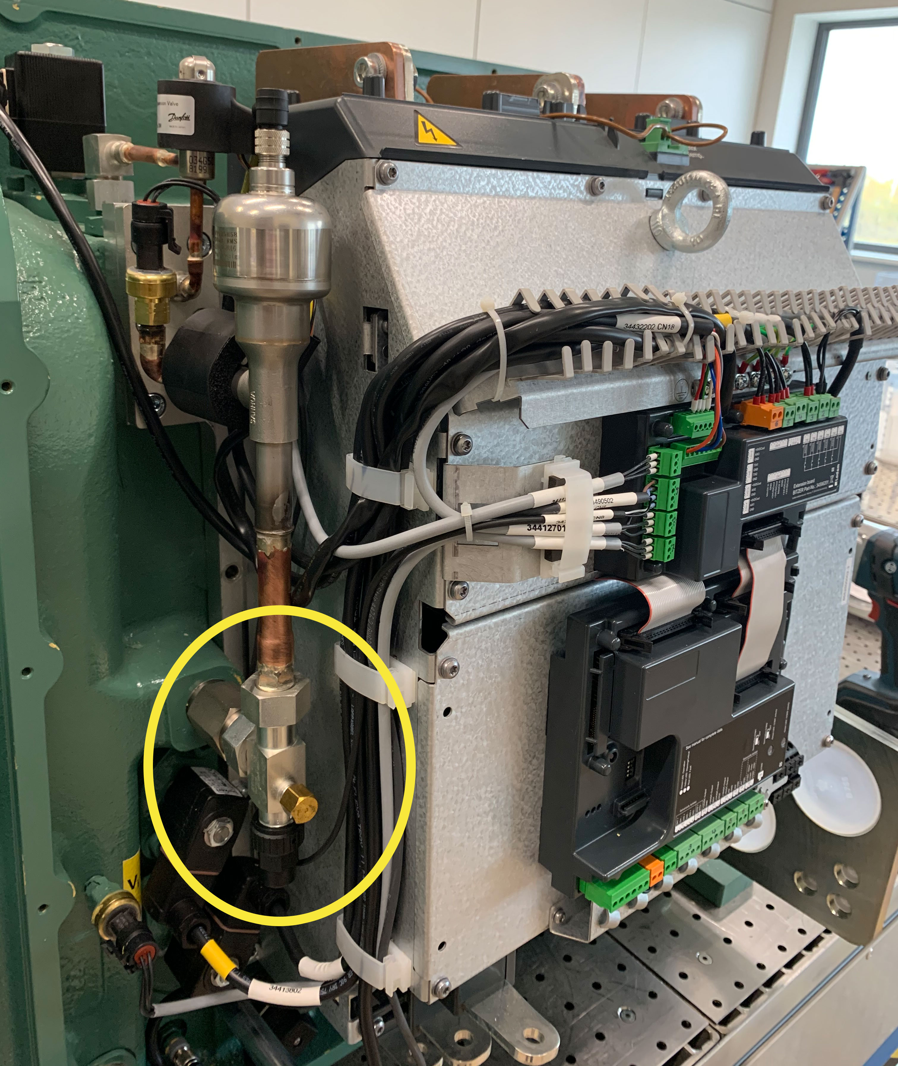 - Extract refrigerant via the marked shut-off valve (see foto below) and reuse refrigerant.