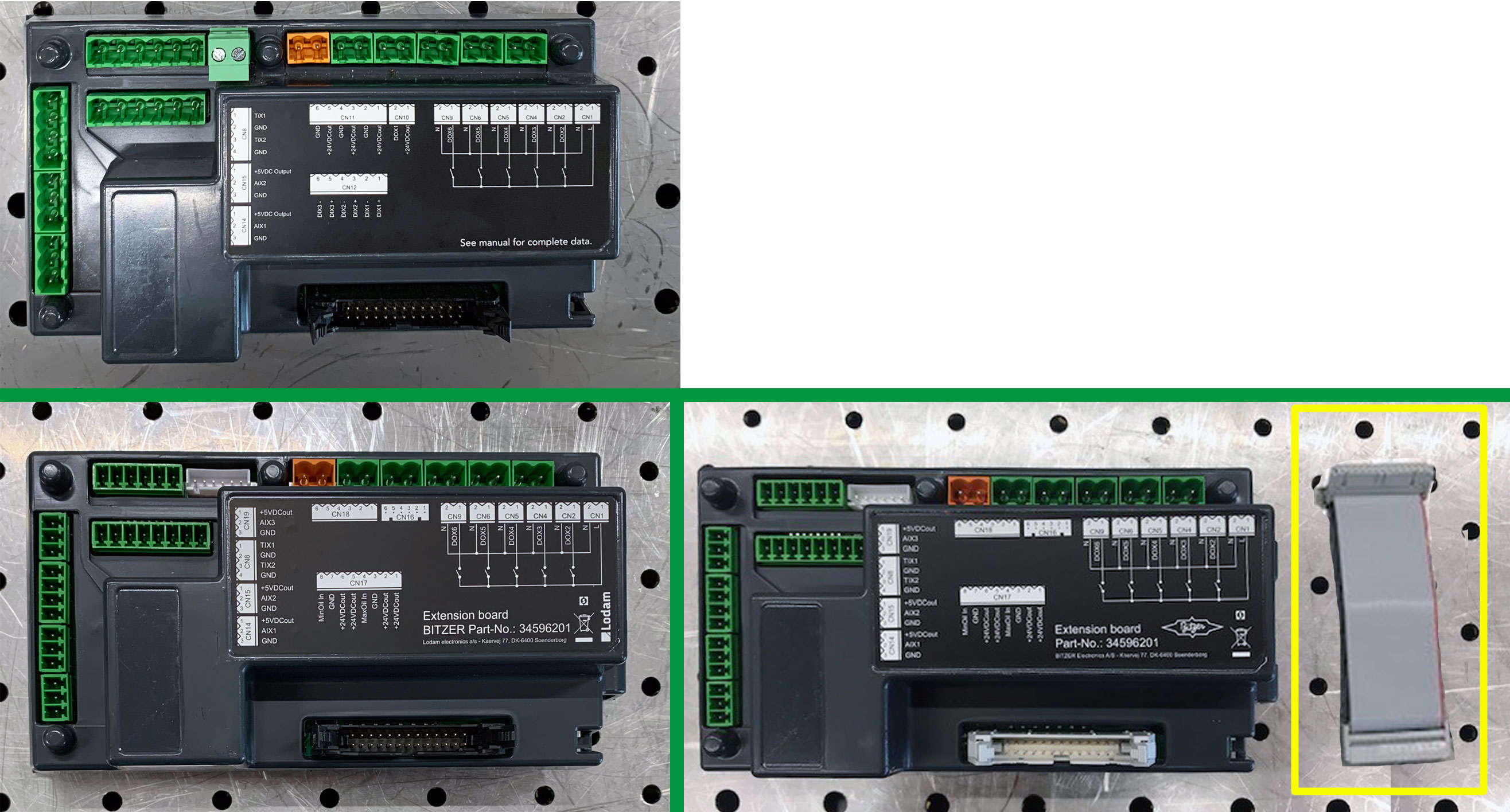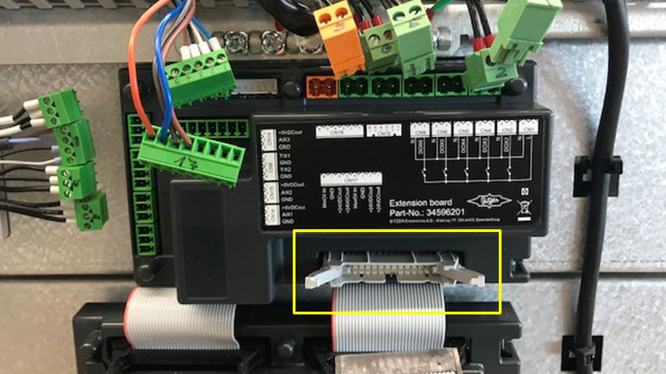- The existing black ribbon cable leading from the extension board to the control board must be replaced with the enclosed grey/white ribbon cable.